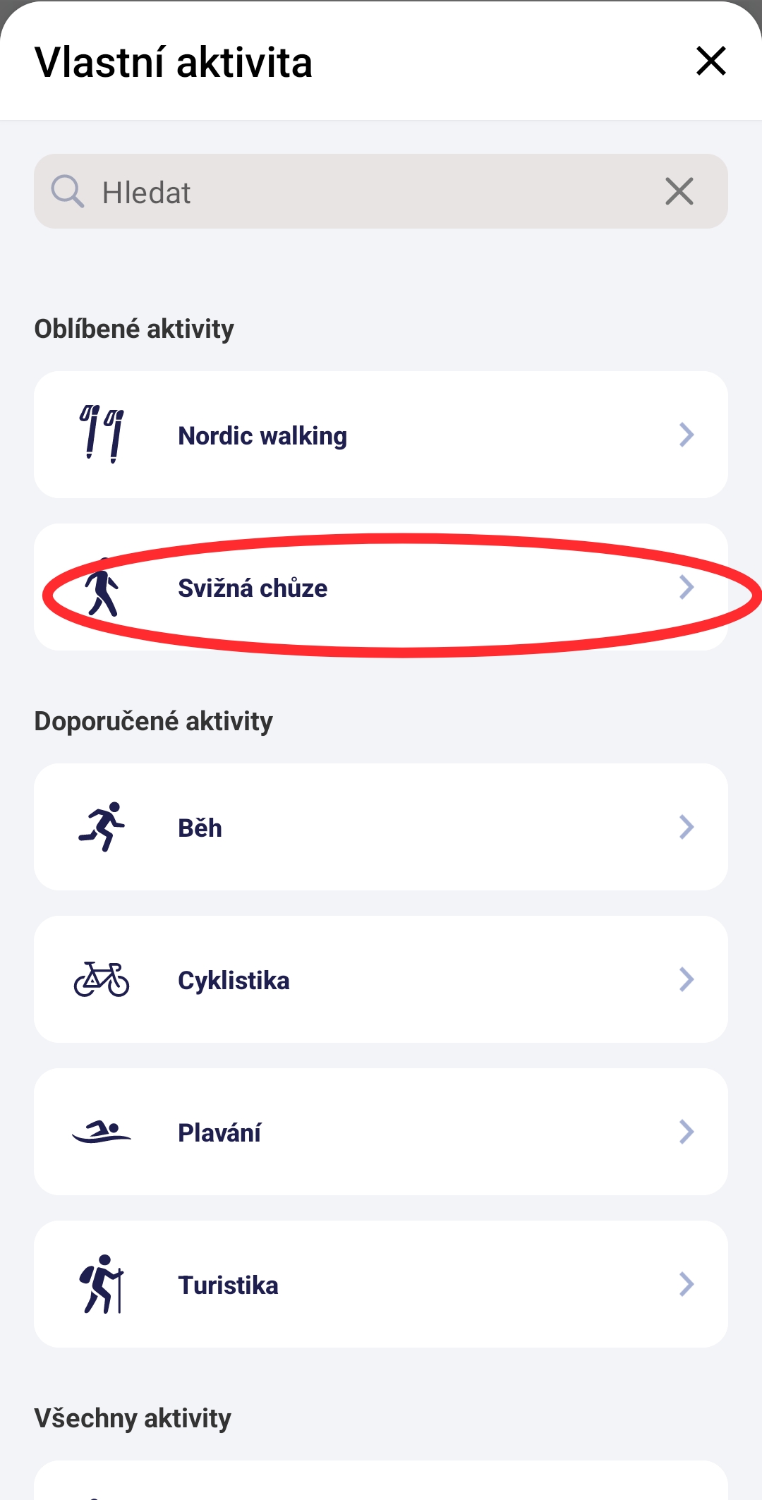 vybrat druh aktivity,