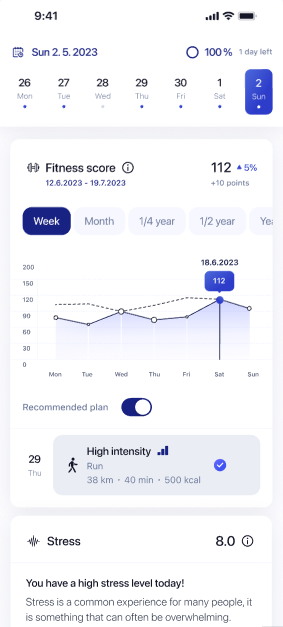 The Fitness Score is a long-term indicator of your body’s overall fitness. It helps you understand how your lifestyle especially movement, recovery, and mental load affects your physical condition over an extended period.